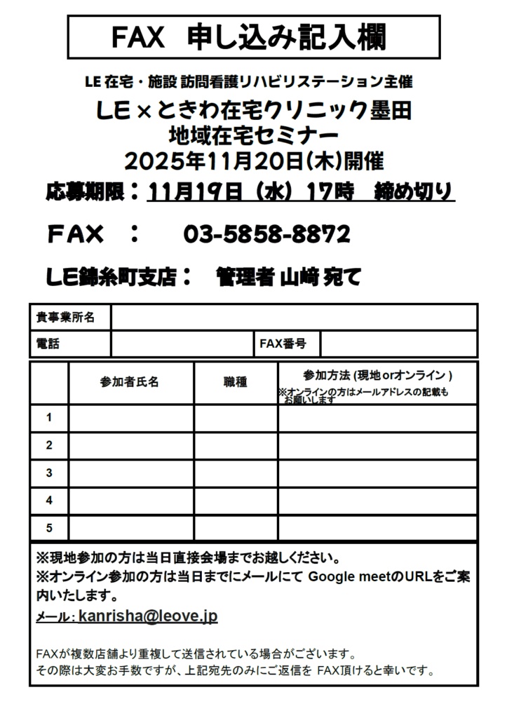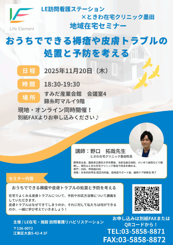 2025年11月20日(木)、LE在宅・施設 訪問看護リハビリステーション様主催の地域在宅セミナーにて、ときわ在宅クリニック墨田院長 野口拓哉が講演を行います。