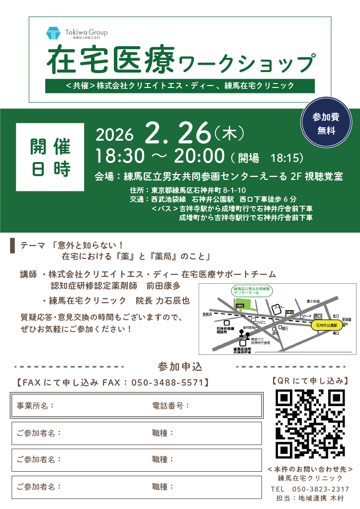 2026年2月26日(木)、株式会社クリエイトエス・ディー様と練馬在宅クリニック共催の在宅医療ワークショップを行います。参加費無料ですので、ぜひお気軽にご参加ください。